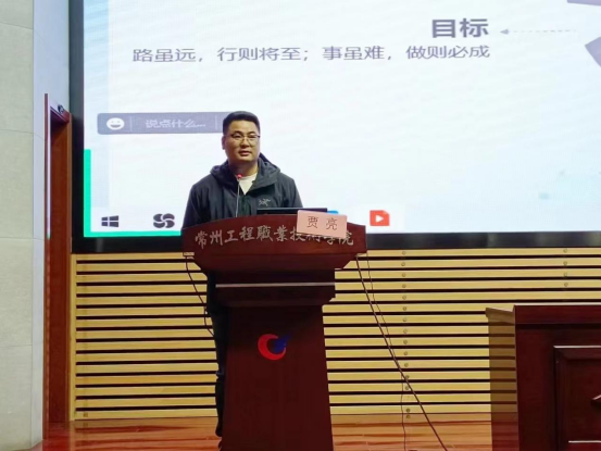 首位主讲嘉宾是建工0621班的贾亮,在校期间,他曾担任建工系和学校员工会主席,荣获国家奖学金等荣誉。现就职于金土地集团,先后取得一级建造师、高级工程师等专业技能证书。工作期间他多次获评“优秀项目经理”,他负责的机电学院、常州金融中心、邹区实验学校、清云澜湾等项目多次获评“江苏省文明工地”、“江苏省’扬子杯’优质工程奖”。贾亮以“乘风破浪,砥砺前行”为主题,结合自身的经历,详细讲述了如何在技术岗位深耕,如何管理好团队,也告诫大家要团结合作,拥有一颗感恩的心。最后,他勉励在场老员工,正处于学本领、涨知识、打基础的关键阶段,要增强自律意识、努力奋斗、积极进取,唯有奋斗才是青春最动人的姿态。他鼓励青年学子积极实践、增加阅历,砥砺前行,努力成为堪当民族复兴重任的时代新人。