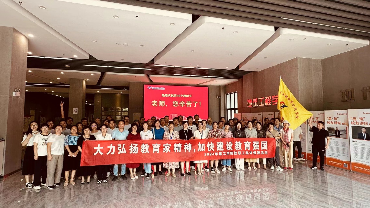 9月10日中午,参加活动的60余名教职员工拉着“大力弘扬教育家精神 加快建设教育强国”横幅、齐喊“教师节快乐!”的祝福语从现代建筑技术馆出发集体慢跑,将热汗化作对教师节的礼赞。