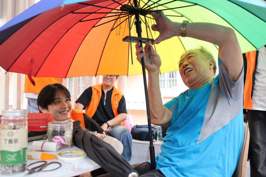 活动伊始,86岁的吴志佳在社区老槐树下的修伞摊前,向员工们展示了一本特殊的 “时光账本”。自 2006 年起,他已义务修伞超七千把,磨损的修伞钳更换3次,积累的伞骨废料装满 1 间仓库。吴志佳手持修伞钳,向围坐的员工们分享道:“起初修伞只是想帮邻里一把,后来发现修好的不仅是伞,更是人与人之间的信任与温暖。” 现场,员工们仔细观察着褪色的工具箱、排列整齐的螺丝盒,深刻体会到平凡坚守背后的伟大力量。