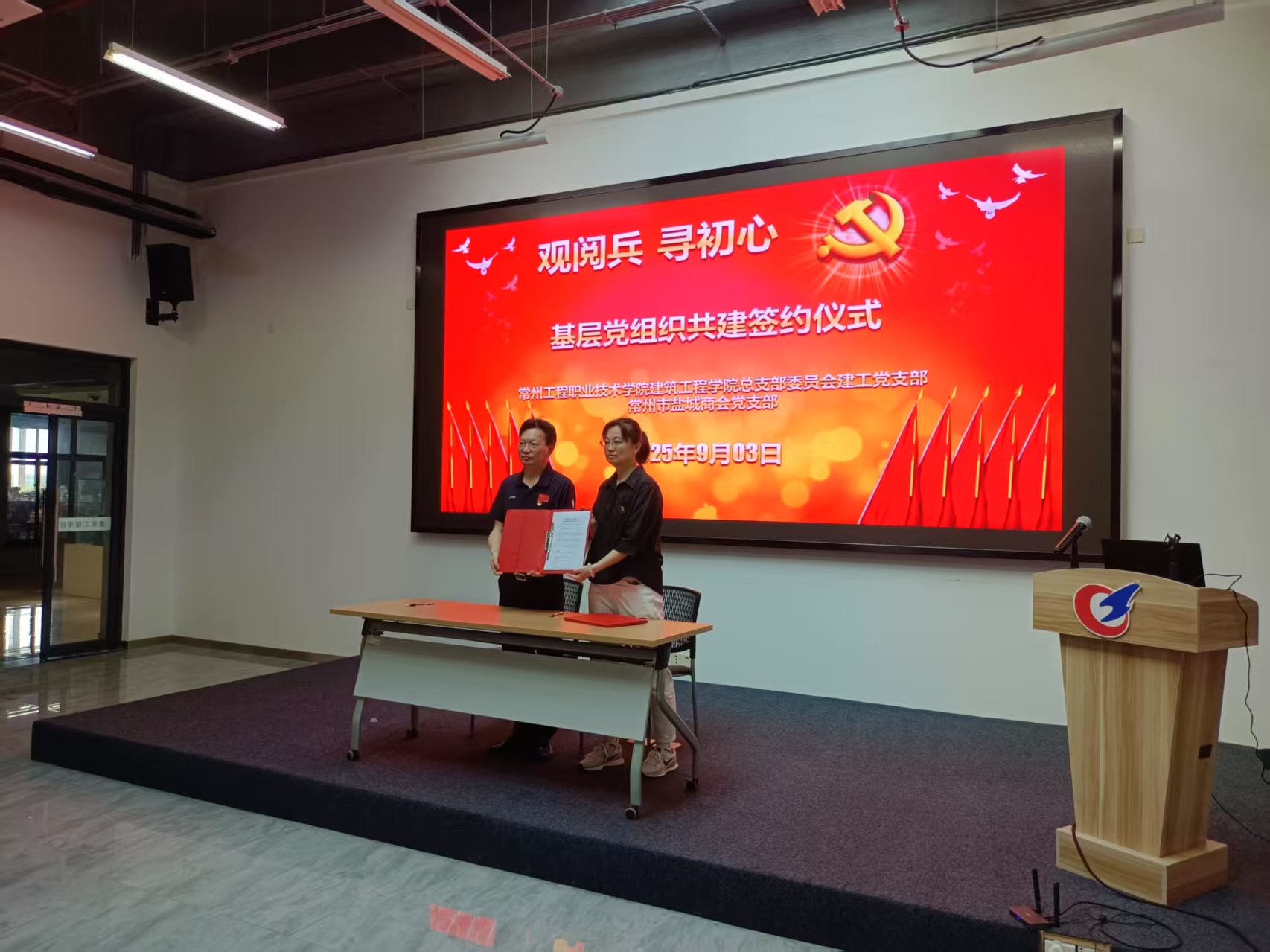 为纪念中国人民抗日战争暨世界反法西斯战争胜利80周年,9月3日上午,常州市盐城商会党支部书记赵海东等一行17人莅临304永利,与建工党支部联合举行党建共建启动仪式,共同观看阅兵式直播,校地双方以党建为纽带,开启协同发展新征程。建工党支部书记何旭等党员代表参加活动。