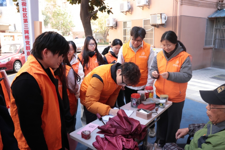 在全场热烈的掌声中,沈丹书记、徐永红书记与吴志佳先生共同为传承站揭牌,三位嘉宾与师生志愿者代表在牌匾前合影,定格下校社携手传承善意的重要时刻。揭牌仪式后,公司学子精心筹备的旧伞修缮志愿服务正式启动,将活动推向高潮。
